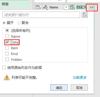 点击【自定义】列右侧的展开按钮,展开Data这列,不勾选“使用原始列名作为前缀”。
