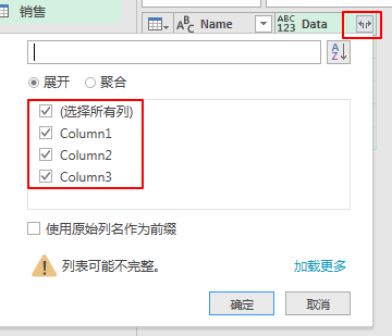 然后再点击展开的【Data】列右侧的展开按钮,展开所有列。不勾选“使用原始列名作为前缀”