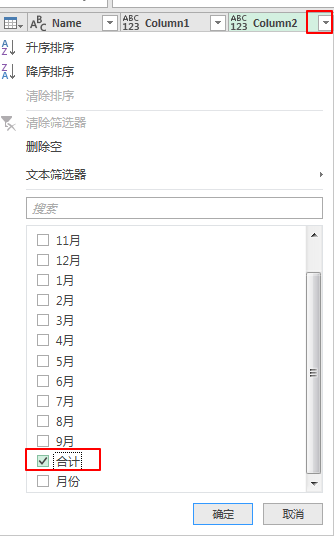 6.那现在要做的就是把【Column2】这列的合计筛选出来就可以了。点击右侧的筛选按钮,勾选“合计”,点击确定。