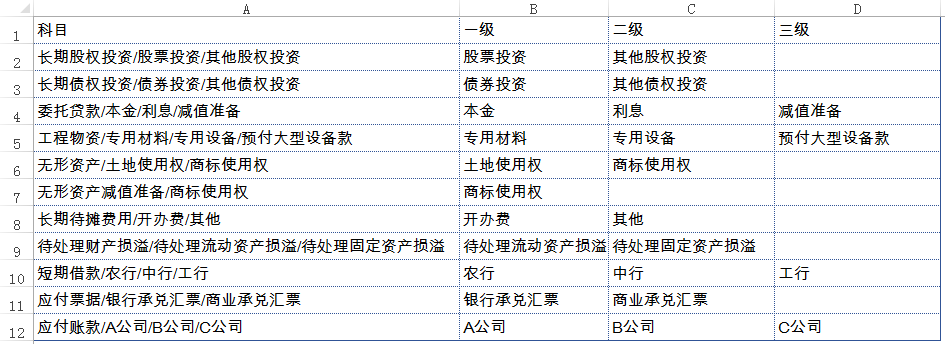 如同下面这样的一张会计科目表,我们需要将A列的科目明细分开,分别放在BCD列。