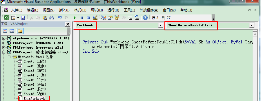 第三步:由各工作表跳回目录打开VBA编辑器,然后在左侧工程资源管理器窗口,双击EXCEL对象里面的“ThisWorkbook”,在右侧的代码窗口输入如下代码:PrivateSubWorkbook_SheetBeforeDoubleClick(ByValShAsObject,ByValTargetAsRange,CancelAsBoolean)Worksheets("目录").ActivateEndSub